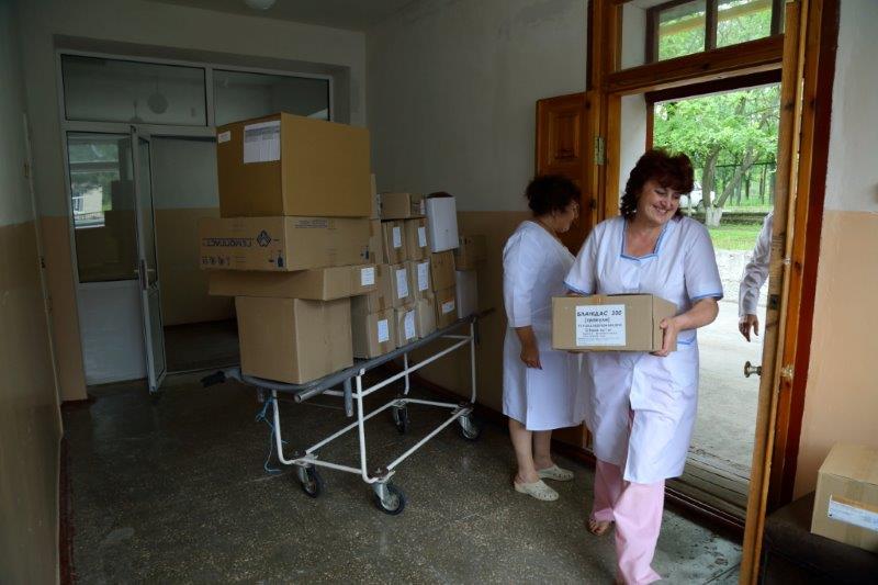 Dokuchaevsk, Donetsk region, Chief nurse Elena Petrovna carries box with medical disposable materials/ Yurii Orlov, ICRC. Поширити