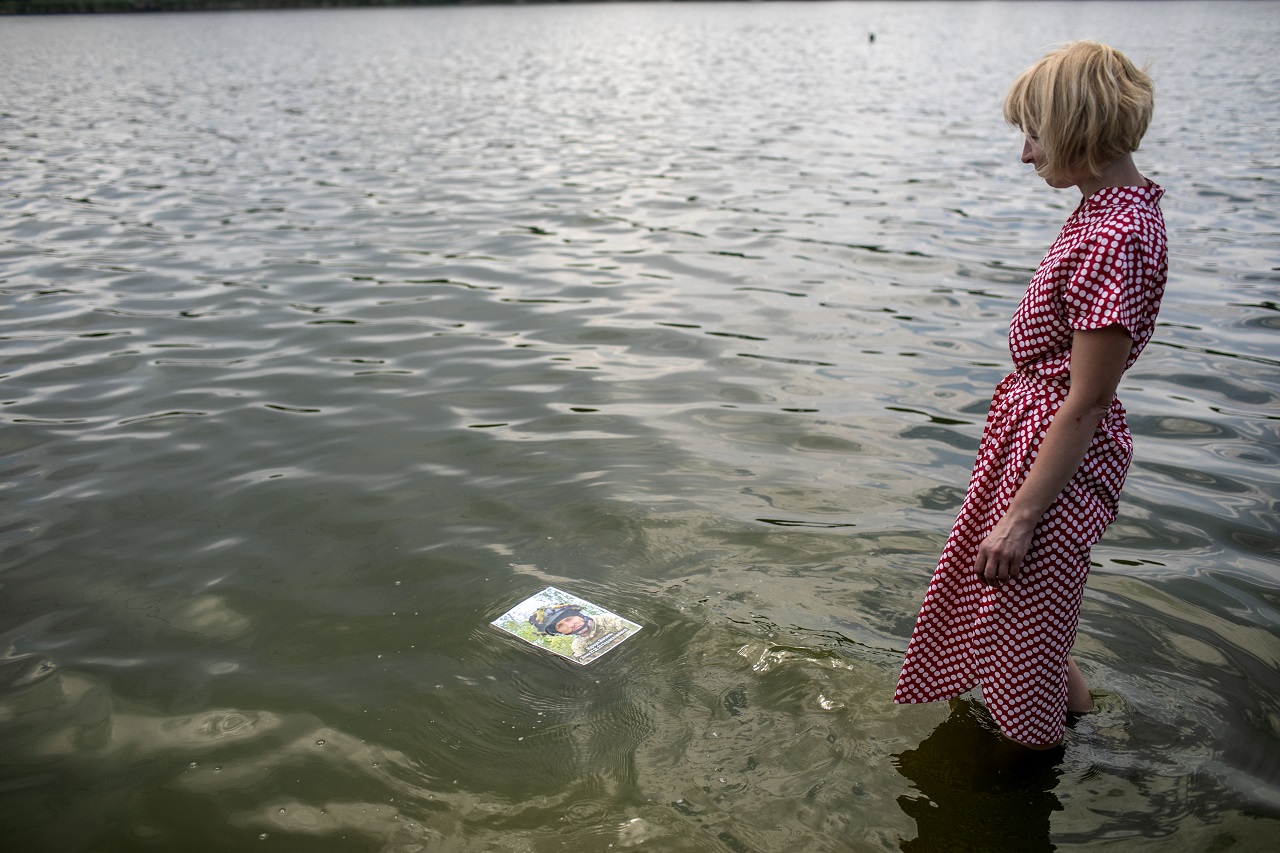 The picture of Vasil (i dont have his age), who went missing in action on 27.1.2023, while fighting Russian Vagner troops at the village of Praskoveevka near Soledar, floats in the water of lake Svyatoshyns'ke, where he and his girlfriend Nina Katchenka ( R-47) were hanging out. Kyiv, Ukraine. 17.7.2024