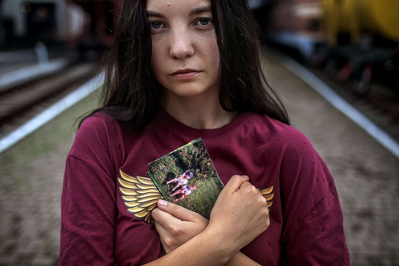 Olena (26), standing in Kyiv train station, holding a picture of her and her older brother Andrie, while they were kids. Andrie ( age 27). Was part of the 77 airborne assault brigade and went missing in action on 4.12.2022 in Luhansk Oblast. They last met in the fall of 2022 at Ternopoli train station where Andrie was living. ' Every time I think of him, I feel he is alive and that he will come back to us. When I have bad days I dream about him and in my dreams he comes back and says he is alive and all is well, therefor I hope everything will be fine and I do believe he will come back' Kyiv, Ukraine. 18.7.2024
