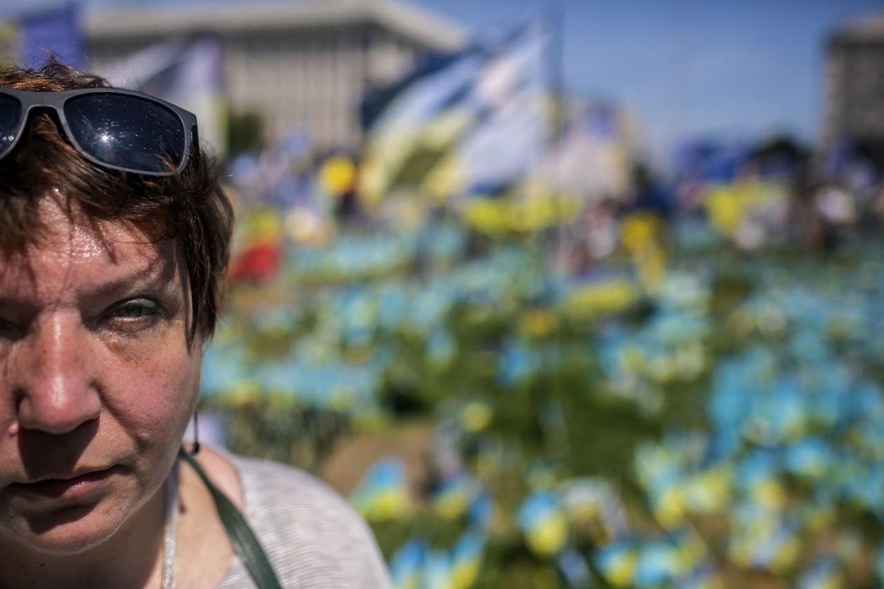 Nina Kobalk (47), standing in Maidan square where flags for fallen Ukrainian soldiers are being planted by civilians. Her brother Andrie (48) married + 3 children and was living in Mariupol and joined the 107 defense brigade of the territorial defence forces of Ukraine in 2022. On 21.3.2022 he went missing with his entire unit near Mariupol. The last time the family was in touch with him was 20.2022. Kyiv, Ukraine. 19.7.2024