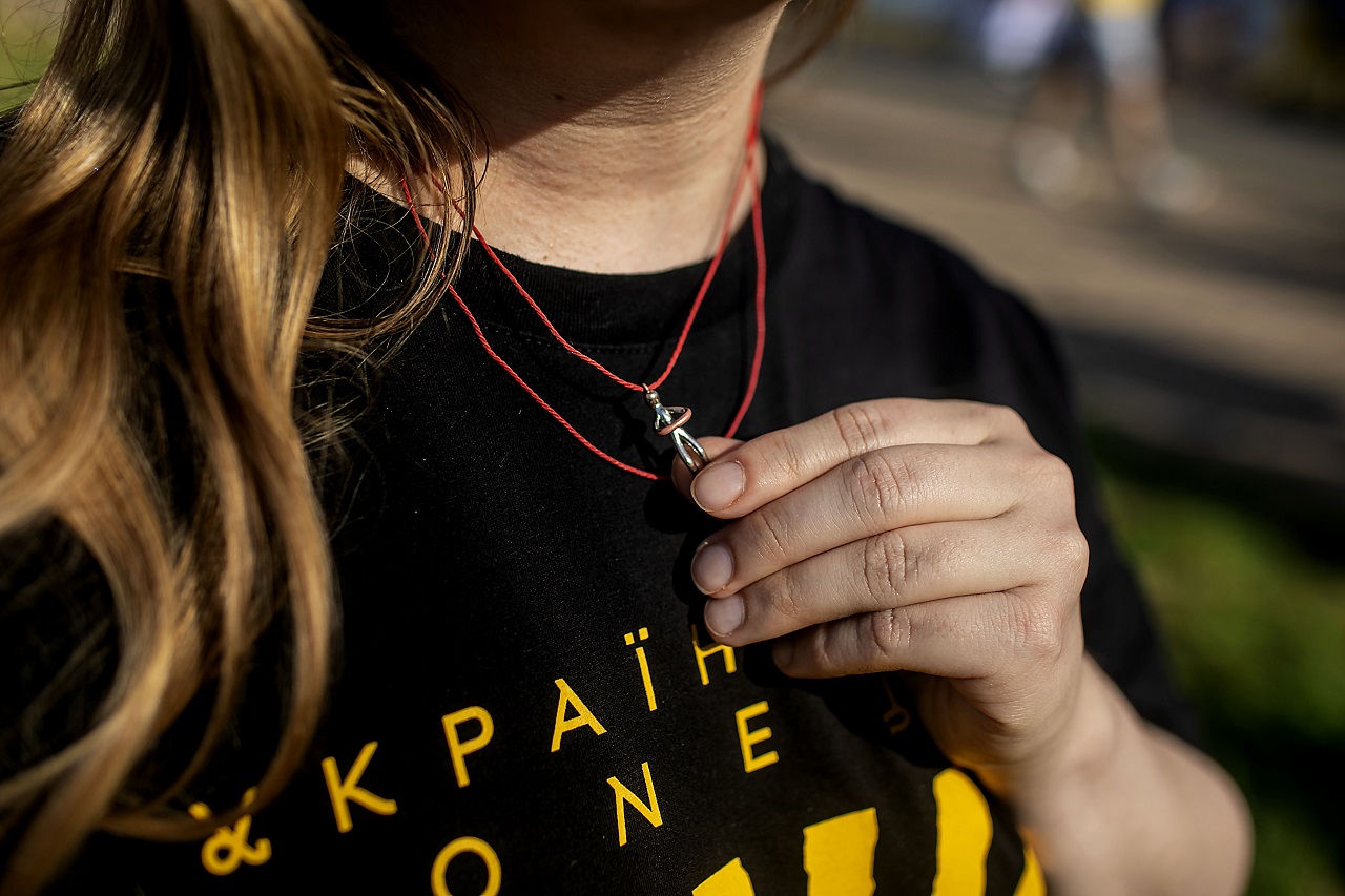 Alina Potpova (34).at the weekly protest for Ukranian POWs rlese in Kyiv. she has half a neclkese on her , while the other half is with Lyosha (30) her fiance.. He joined the Ukrainian army at the beginning of the Russian invasion. 47th assault brigade. He went missing in action on 24.7.2023 in Zaporizhia region. 'if someone would have called me right now telling me Lyosha is sitting next to him, I would tell Lyosha to be strong to hold on and that I love him very much' Kyiv, Ukraine. 21.7.2024
