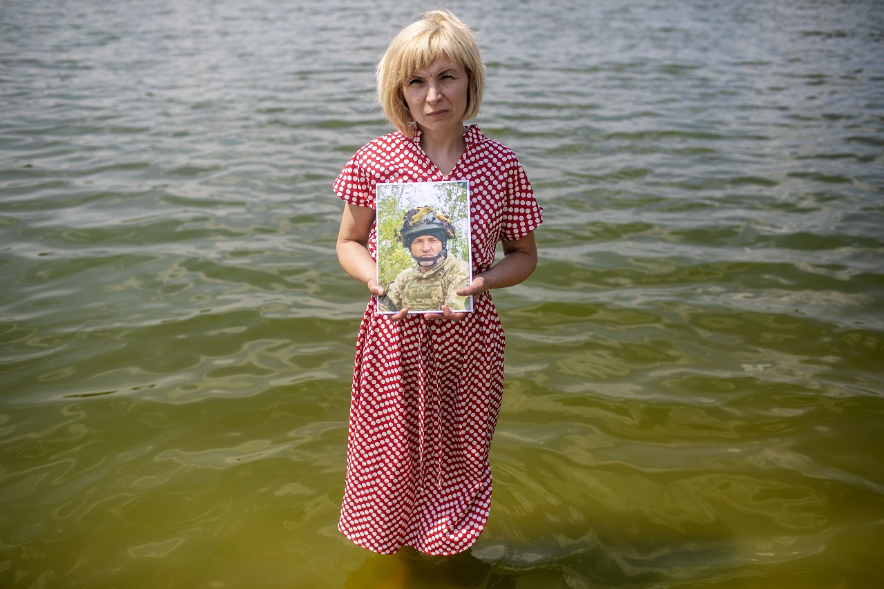 Nina Katchenka (47), standing inside the water of lake Svyatoshyns'ke in Kyiv, holding the picture of her boyfriend Vasil (i dont have his age), who went missing in action on 27.1.2023, while fighting Russian Vagner troops at the village of Praskoveevka near Soledar, where swimming and relaxing during hot summer days." i do believe Vasil is alive and will come back to me" Kyiv, Ukraine. 17.7.2024