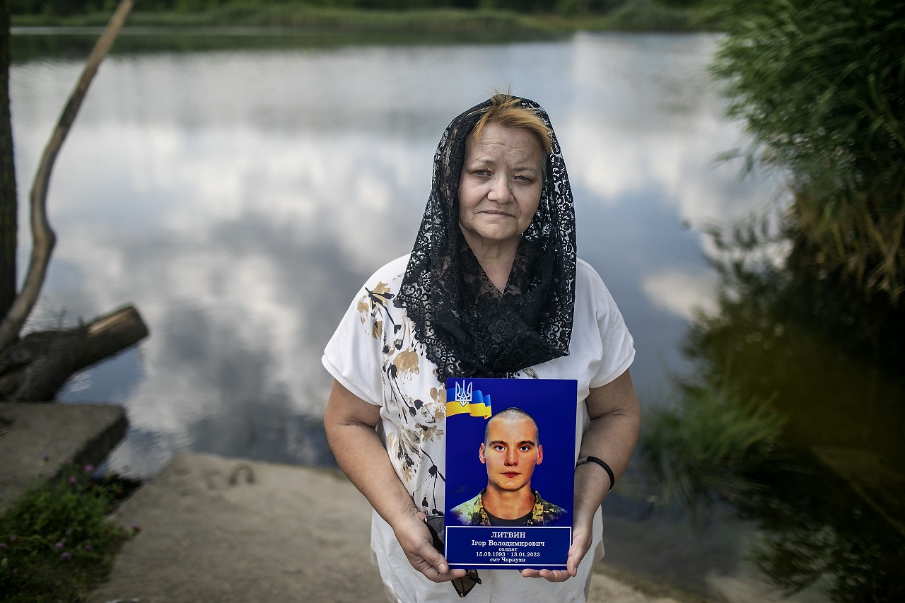 Valentina Sabostienko ( 54), standinng near a lake were her son Igor’s liked to swim, near Chornukhy village. she holds her son picture. her son Igor Latvin (30) died in the war on 13.1.2023. standing near her sons’s grave in Chornukhy, cemetry.. After the invasion began in 2022 , Igor became part of the Territorial Defence and joined the army by August 2022. He joined 77 airborne assault brigade, went to training in Zhtomer and by January 2023 was sent to Soledar. By 9.1.2023 he was in Soledar, and died in battle on 13.1.2023,Even though he was confirmed KIA (killed in action). Valentina still wants to believe he is alive: ' I hope one day , my son will knock on my window and will say- hi mom i'm back and i'm alive'. Chornukhy, Ukraine. 26.7.2024