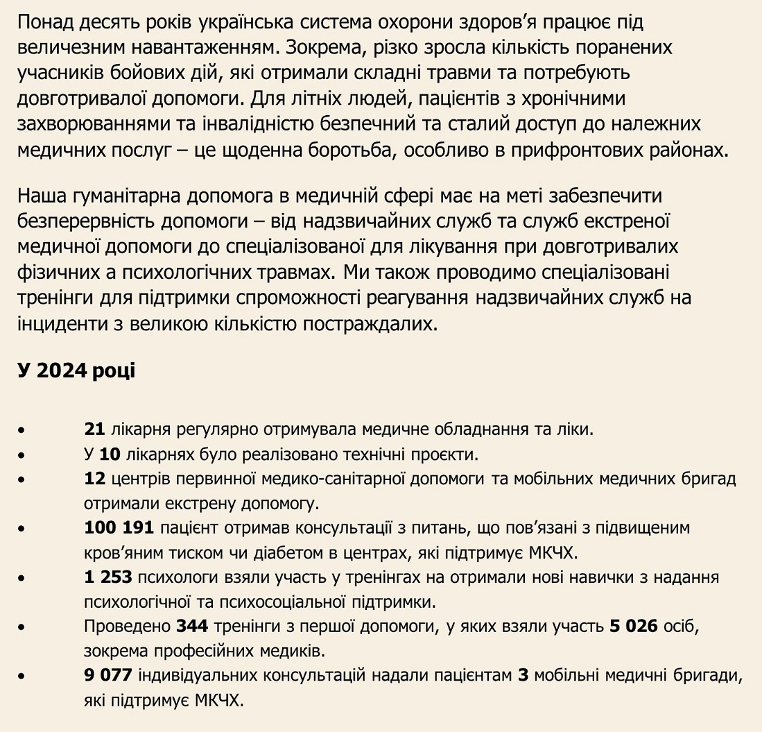 В умовах відключень електроенергії та бойових дій лікарі продовжували цілодобово виконувати свої обов’язки, хоча й самі часто потребували допомоги через психологічне вигорання. В рамках реагування на надзвичайні ситуації МКЧХ надав аптечки першої допомоги.